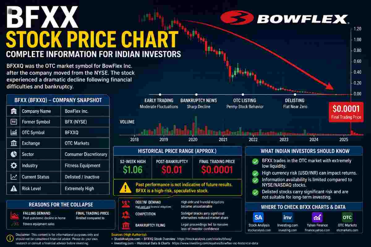 For investors in India who search for the BFXX stock price chart, the symbol usually refers to BFXXQ, the over-the-counter ticker that represented BowFlex Inc. after the company moved from the New York Stock Exchange to the OTC market. Understanding this stock requires more than simply viewing a price graph because the company went through a major financial collapse that changed how the chart looks today.